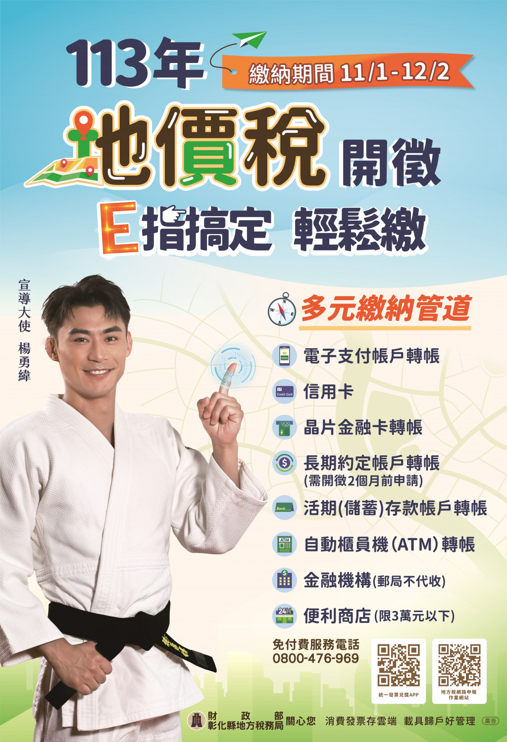 託播內容:113年地價稅於11月開徵,繳納期間自11月1日至12月2日,請如期繳納,彰化縣地方稅務局關心您。